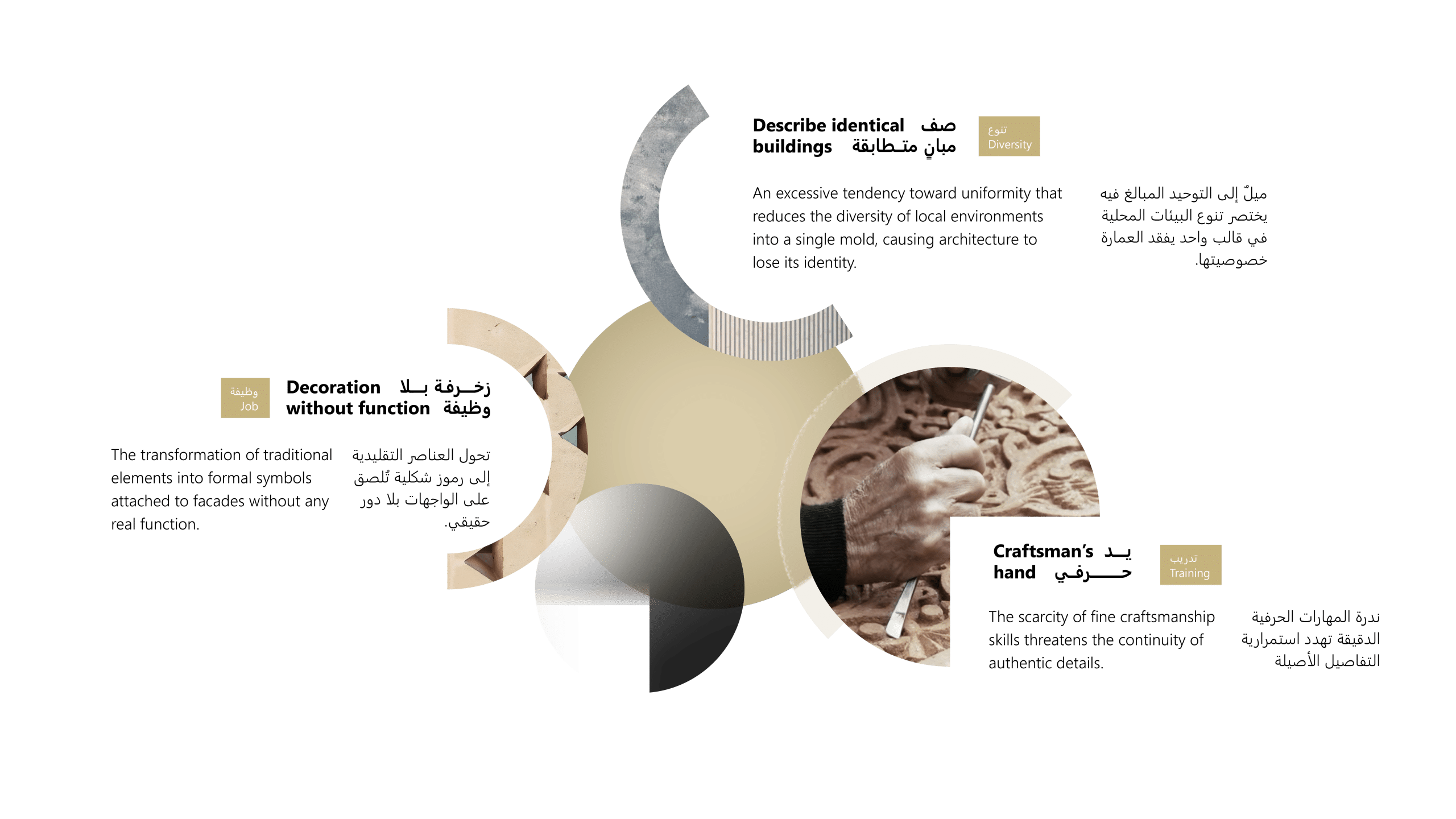 تأصيل العمارة لا يكفي أن يُرفع شعارًا، بل يحتاج إلى ممارسة واعية تواجه عدّة عوائق. فمن أخطر ما يواجهه أن تتحول العناصر التقليدية إلى رموز شكلية تُلصق على الواجهات بلا دور حقيقي. والتحدي الآخر هو الميل إلى التوحيد المبالغ فيه، حيث يُختصر تنوع البيئات المحلية في قالب واحد يفقد العمارة خصوصيتها. أما على مستوى التنفيذ، فندرة المهارات الحرفية الدقيقة تهدد استمرارية التفاصيل الأصيلة. ومع ذلك، تبقى المعالجة ممكنة حين يرتبط كل عنصر بوظيفته، ويُفسح مجال للتنوع المدروس، ويُستثمر في تدريب الحرفيين وتوثيق أساليبهم. عندها فقط يتحول التأصيل من فكرة مثالية إلى ممارسة قابلة للاستمرار.